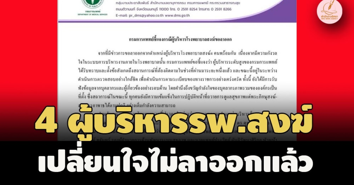 กรมการแพทย์ เผยแพร่ข่าวประชาสัมพันธ์ แจง 4 ผู้บริหาร รพ.สงฆ์ เปลี่ยนใจขอถอนใบลาออก ปมผู้มีอำนาจส่อไม่โปร่งใส-ความไม่ปลอดภัยทั้งทางร่างกายจิตใจรวมถึงครอบครัว หลังรับทราบความใส่ใจห่วงใยจากผู้บังคับบัญชาระดับสูง พร้อมเดินหน้าทำงานต่อไป