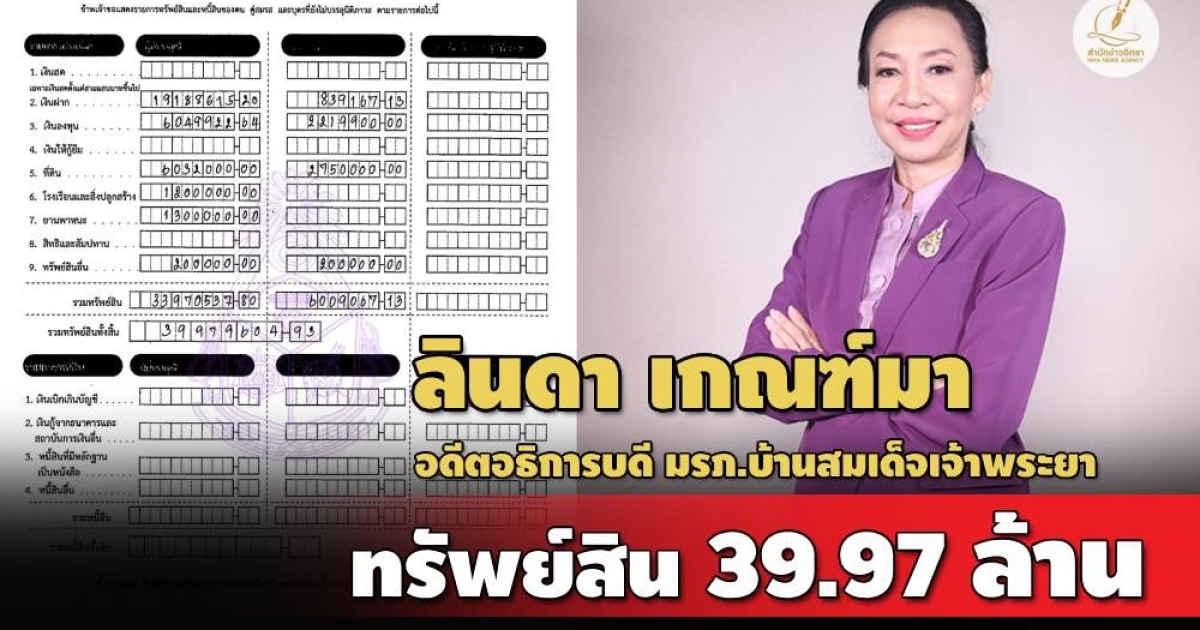 ป.ป.ช.เปืดทรัพย์สิน 'ลินดา เกณฑ์มา' อดีตอธิการบดี ม.ราชภัฏบ้านสมเด็จเจ้าพระยา มีทรัพย์สินกว่า 39 ล. มีเงินฝาก 19 ล. ที่ดิน 4 แปลง สะสมทองรูปพรรณ-สร้อยคอทอง-สร้อยข้อมือ รายได้ 5.8 ล./ปี