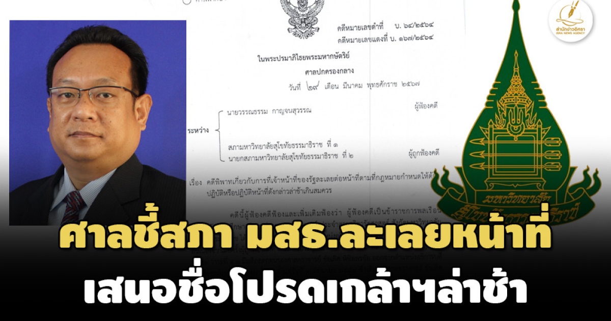 ศาลปกครองกลางได้พิพากษาแล้ว ว่า สภามหาวิทยาลัยละเลยเลยต่อหน้าที่ตามกฎหมายที่กำหนด ให้ปฏิบัติหรือปฏิบัติหน้าที่ดังกล่าวล่าช้าเกินสมควร โดยระบุว่า กรณีนับได้เป็นระยะเวลากว่า 2 ปี 8 เดือน ที่ผู้ถูกฟ้องคดีทั้งสองพึงมีหน้าที่ในการเสนอชื่อผู้ฟ้องคดีเพื่อขอโปรดเกล้าฯ แต่งตั้งเป็นอธิการบดีมหาวิทยาลัยสุโขทัยธรรมาธิราชต่อสำนักงานปลัดกระทรวงการอุดมศึกษา วิทยาศาสตร์ วิจัยและนวัตกรรม (อว.) แต่ผู้ถูกฟ้องคดีทั้งสองหาได้ปฏิบัติหน้าที่ดังกล่าวแต่อย่างใดไม่ ข้ออ้างของผู้ถูกฟ้องคดีทั้งสองในทำนองว่า จำต้องทำการหารือประเด็นปัญหาข้อกฎหมายจากหน่วยงานต่าง ๆ จึงไม่อาจหักล้างแนวทางการพิจารณากลั่นกรองเรื่องร้องเรียนเกี่ยวกับการเสนอโปรดเกล้าฯ แต่งตั้งอธิการบดีที่รัฐมนตรีว่าการ อว. ได้กำหนดแนวทางการพิจารณาไว้เป็นการเฉพาะแล้วได้