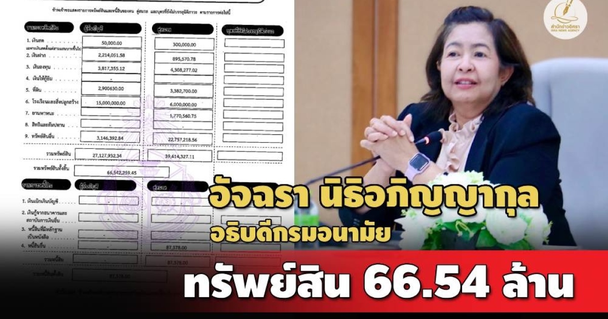 ป.ป.ช. เปิดทรัพย์สิน 'อัจฉรา นิธิอภิญญากุล' อธิบดีกรมอนามัย มีทรัพย์สินกว่า 66.54 ล. ที่ดิน 3 แปลง บ้าน 1 หลังมูลค่า 15 ล. สะสมเครื่องประดับ รายได้ 1.2 ล./ปี