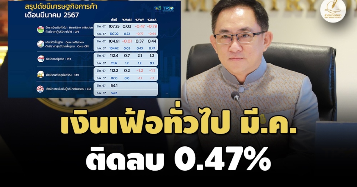 เมื่อวันที่ 5 เม.ย. นายพูนพงษ์ นัยนาภากรณ์ ผู้อำนวยการสำนักงานนโยบายและยุทธศาสตร์การค้า (สนค.) กระทรวงพาณิชย์ แถลงดัชนีเศรษฐกิจการค้า เดือน มี.ค.2567 ว่า ดัชนีราคาผู้บริโภคทั่วไปหรืออัตราเงินเฟ้อทั่วไป (CPI) ในเดือน มี.ค.2567 เท่ากับ 107.25 หดตัว 0.47% เมื่อเทียบกับช่วงเดียวกันของปีก่อน ติดลบต่อเนื่องเป็นเดือนที่ 6