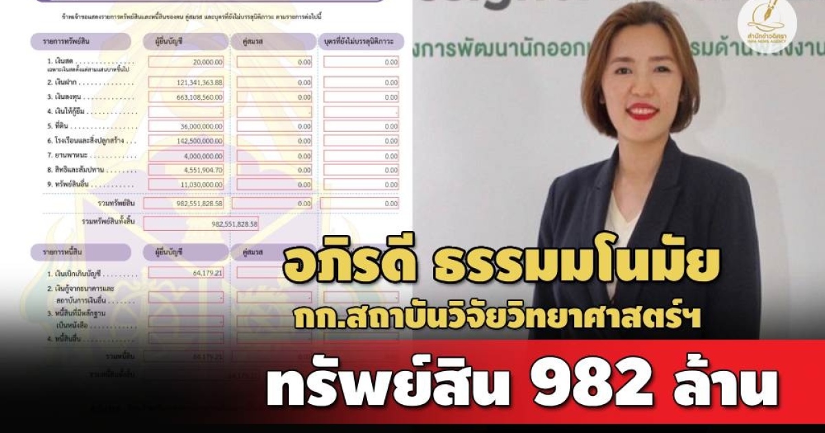 ป.ป.ช.เปิดทรัพย์สิน 'อภิรดี ธรรมมโนมัย' กรรมการสถาบันวิจัยวิทยาศาสตร์และเทคโนโลยีแห่งประเทศไทย มีทรัพย์สินกว่า 982 ล. เงินฝาก 121 ล. เงินลงทุน 663 ล.รายได้ 21 ล./ปี