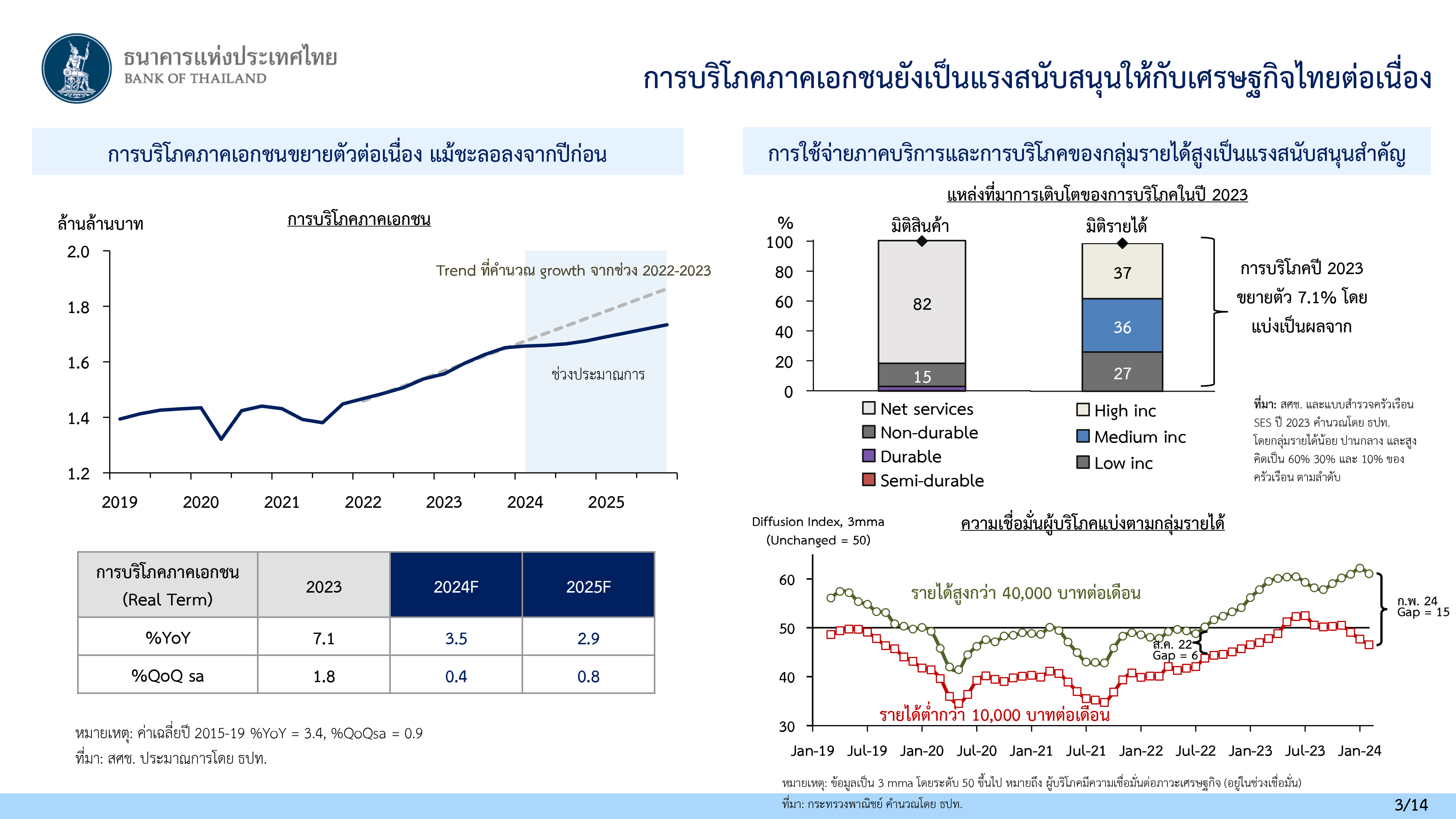 โดยได้รับแรงสนับสนุนจากภาคการท่องเที่ยวที่ปรับดีขึ้นทั้งในด้านจำนวนนักท่องเที่ยวและค่าใช้จ่ายต่อคน การบริโภคภาคเอกชนที่ขยายตัวต่อเนื่องแม้จะชะลอลงจากปีก่อนที่ขยายตัวสูง และการใช้จ่ายภาครัฐที่จะกลับมาเพิ่มขึ้นในช่วงที่เหลือของปี ขณะที่การส่งออกมีแนวโน้มฟื้นตัวได้อย่างค่อยเป็นค่อยไปในช่วงครึ่งหลังของปี