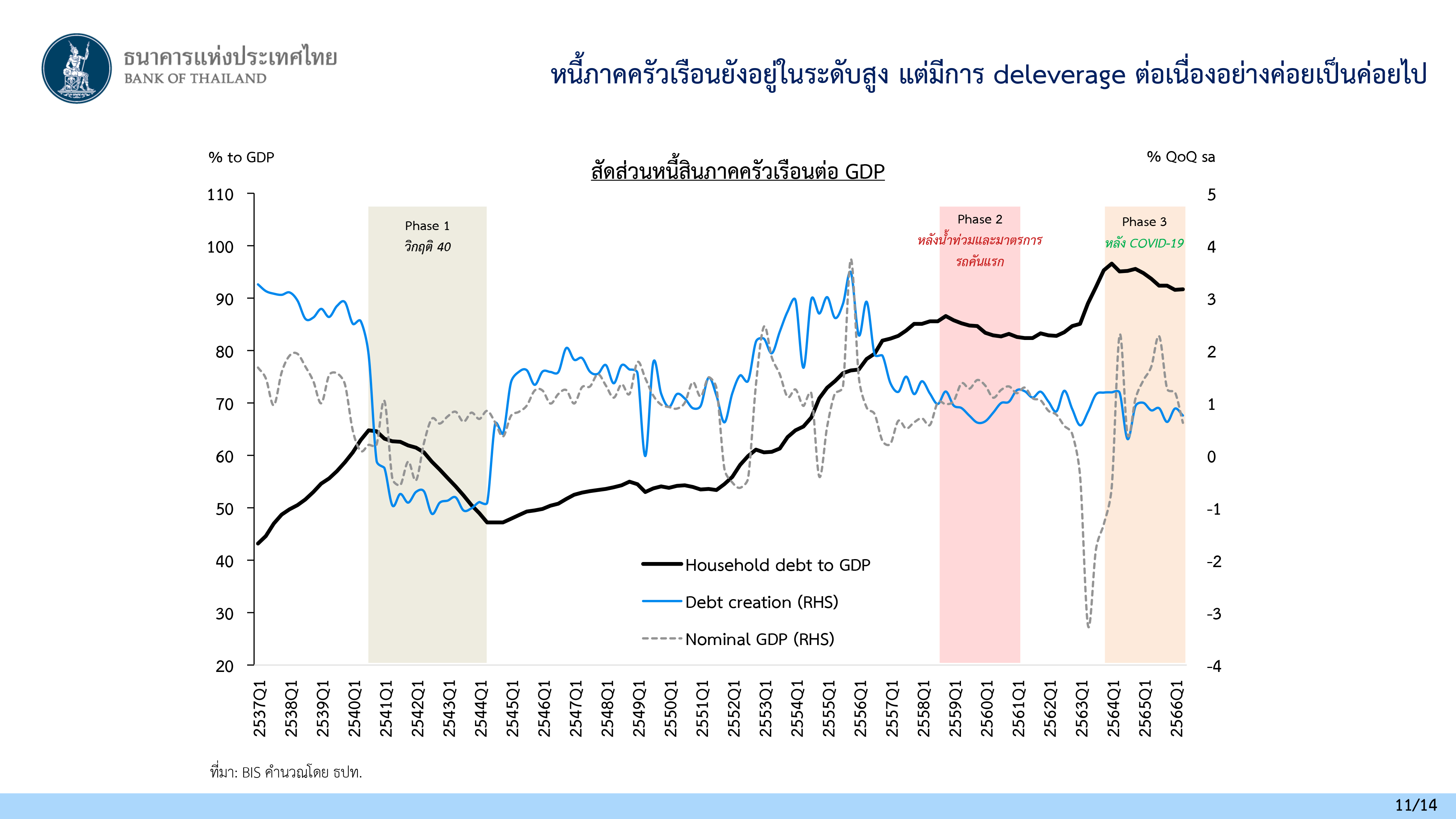 นอกจากนี้ คณะกรรมการฯ มีความกังวลเกี่ยวกับหนี้ครัวเรือนที่อยู่ในระดับสูง และเห็นความสำคัญของกระบวนการปรับลดสัดส่วนหนี้ต่อรายได้ (debt deleveraging) ที่ควรมีอย่างต่อเนื่อง ซึ่งจะช่วยลดความเปราะบางของเศรษฐกิจการเงินในระยะยาว รวมถึงพิจารณาว่านโยบายการเงินมีประสิทธิผลจำกัดในการแก้ปัญหาการเข้าถึงสินเชื่อ จึงสนับสนุนนโยบายของ ธปท. ในการดำเนินมาตรการเฉพาะจุดผ่านสถาบันการเงิน โดยเฉพาะมาตรการการให้สินเชื่ออย่างรับผิดชอบและเป็นธรรม (Responsible Lending)