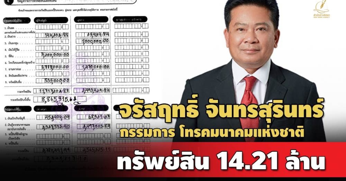 ป.ป.ช.เปิดทรัพย์สิน 'จรัสฤทธิ์ จันทรสุรินทร์' กรรมการ บริษัท โทรคมนาคม แห่งชาติ จำกัด (มหาชน) มีทรัพย์สินกว่า 14,21 ล. ที่ดิน 1 แปลง รถยนต์ 5 คัน รายได้ 1 ล./ปี