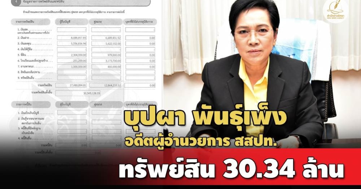 โดย นางบุปผา พร้อมด้วย นายทศพล พันธุ์เพ็ง คู่สมรส แจ้งทีทรัพย์สิน 30,345,128 บาท ไร้หนี้สิน