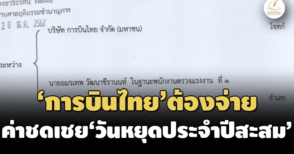คำสั่งพนักงานตรวจแรงงานที่ 6/2566 ของจำเลยที่ 1 ที่ให้โจทก์ (บมจ.การบินไทย) จ่ายค่าจ้างสำหรับวันหยุดพักผ่อนประจำปีสะสมแก่จำเลยที่ 2 จึงชอบแล้ว ไม่มีเหตุให้เพิกถอนคำสั่งดังกล่าว พิพากษายกฟ้อง” คำพิพากษาคดีหมายเลขดำที่ ร 359/2566 คดีหมายเลขแดงที่ ร 935/2567 ของศาลแรงงานกลาง ลงวันที่ 13 มี.ค.2567 ระบุ