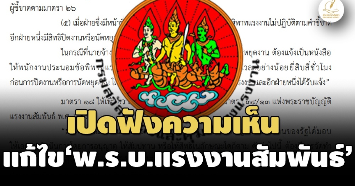 ‘กสร.’ เปิดรับฟังความคิดเห็นแก้ไข พ.ร.บ.แรงงานสัมพันธ์ฯ 11 ประเด็น หากลูกจ้าง ‘นัดหยุดงาน-ปิดงาน’ ต้องแจ้ง ‘นายจ้าง’ ล่วงหน้า 24 ชั่วโมง หากเป็นบริการ 'สาธารณสุข-ไฟฟ้า-ประปา' ต้องแจ้ง 'ประชาชน'ล่วงหน้าอย่างน้อย 7 วัน คงสิทธิ 'ขรก.-จนท.รัฐวิสาหกิจ' รวมตัวได้ แต่ต้องไม่มีวัตถุประสงค์ทางการเมือง