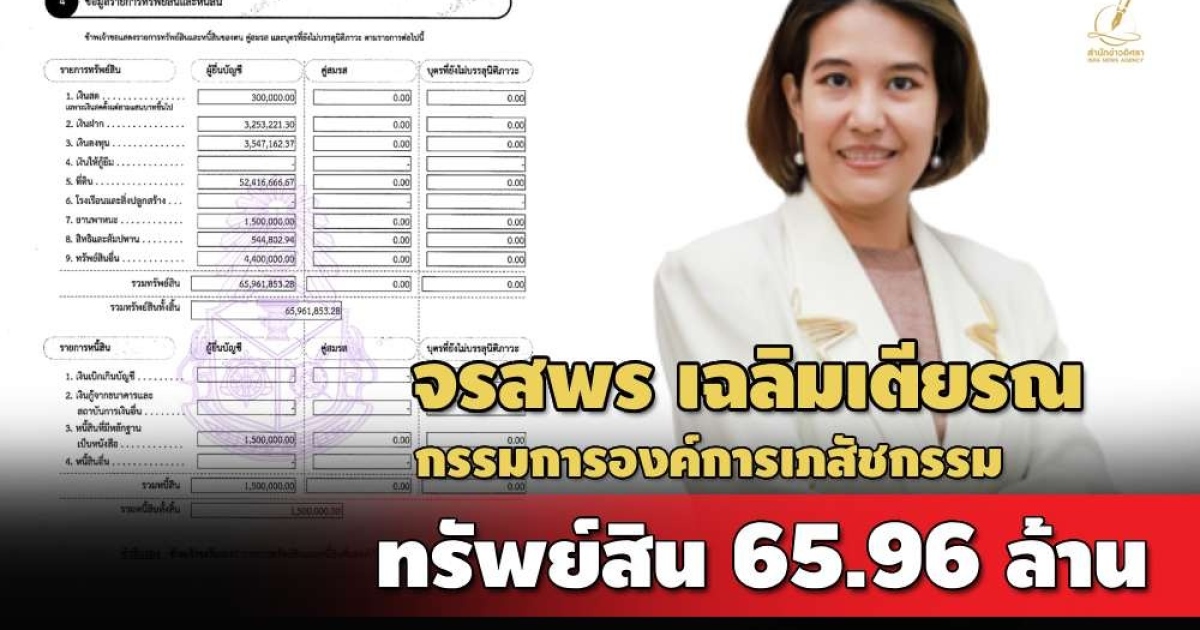 สำนักข่าวอิศรา (www.isranews.org) รายงานว่า เมื่อเร็ว ๆ นี้ สำนักงานคณะกรรมการการป้องกันและปราบการทุจริตแห่งชาติ(ป.ป.ช.) เปิดเผยบัญชีแสดงรายการทรัพย์สินและหนี้ของ น.ส.จรสพร เฉลิมเตียรณ กรณ๊เข้ารับตำแหน่ง กรรมการองค์การเภสัชกรรม เมื่อวันที่ 29 ธ.ค. 2566