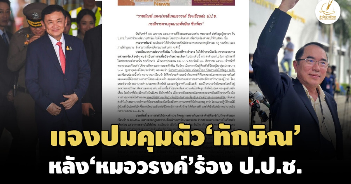 สำนักข่าวอิศรา (www.isranews.org) รายงานว่า เมื่อวันที่ 23 เม.ย. 2567 กรมราชทัณฑ์ เผยแพร่เอกสารชี้แจงประเด็นหมอวรงค์ ร้องเรียนต่อคณะกรรมการป้องกันและปราบปรามการทุจริตแห่งชาติ (ป.ป.ช.) กรณีการควบคุมนายทักษิณ ชินวัตร โดยระบุว่า
