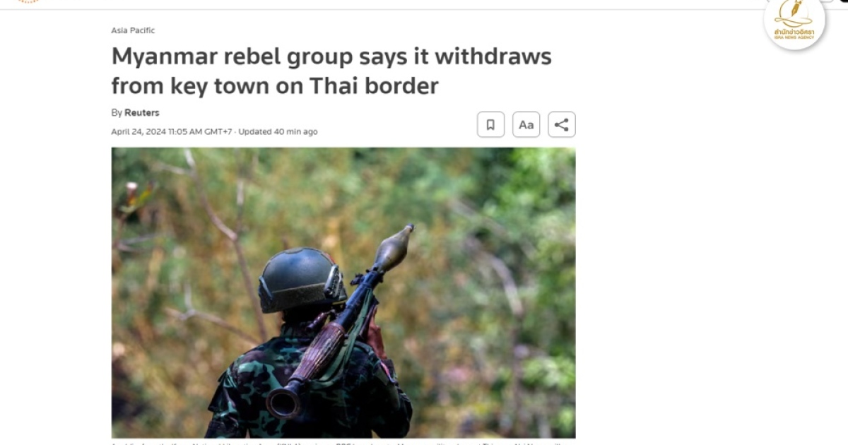 เรียบเรียวจาก:https://www.reuters.com/world/asia-pacific/myanmar-rebel-group-says-it-withdraws-key-town-thai-border-2024-04-24/