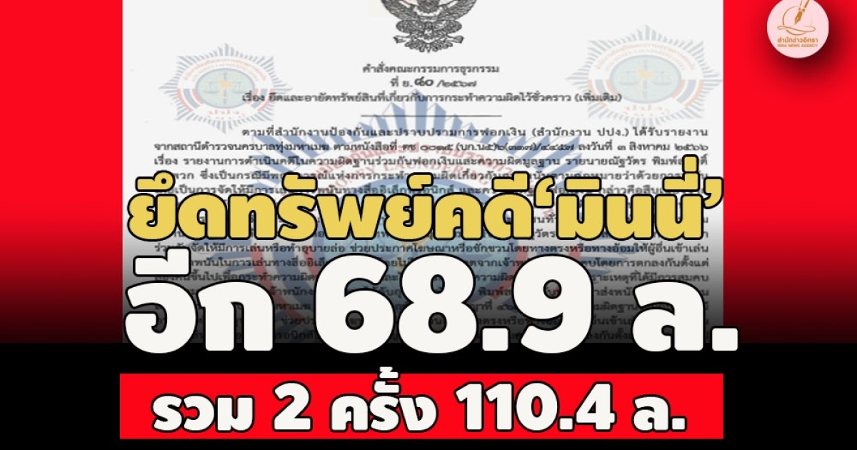 ปปง.สั่งยึดอายัดทรัพย์เพิ่มคดี‘มินนี่’ฟอกเงิน เว็บพนันออนไลน์ ที่ดิน พร้อมสิ่งปลูกสร้างย่านบางเขน-สำโรง สมุทรปราการ เงินฝาก 2 บัญชี อีก 4 รายการ 68.9 ล. ก่อนหน้าโดน 41.4 ล. รวม 2 ครั้ง 110.4 ล.