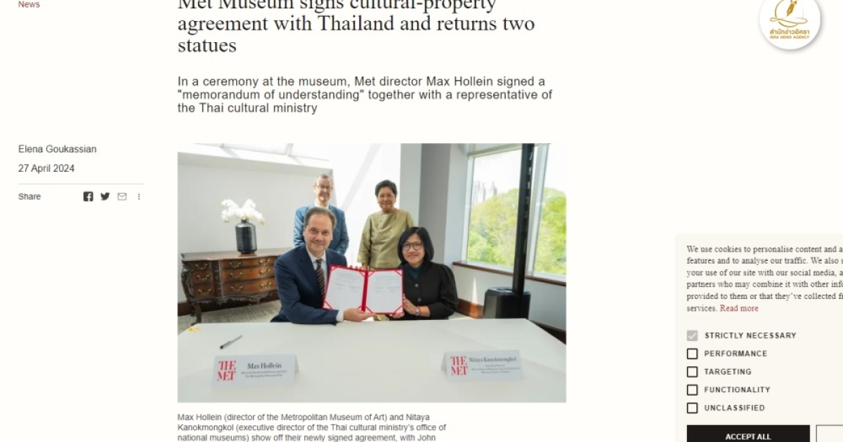 สำนักข่าวอิศรา (www.isranews.org) รายงานข่าวว่าเมื่อวันที่ 25 เม.ย.ที่ผ่านมา ที่พิพิธภัณฑ์ศิลปะเมโทรโพลิแทน หรือ MET (Metropolitan Museum of Art) นครนิวยอร์ก ได้มีการเซ็นบันทึกความเข้าใจกันระหว่าง MET กับรัฐบาลไทย โดยพิพิธภัณฑ์จะใช้โอกาสนี้ส่งคืนประติมากรรมโลหะสมัยศตวรรษที่ 11 สองชิ้นอย่างเป็นทางการ โดยรูปปั้นประติมากรรมทั้งสองจะถูกออกจากคอลเล็คชั่นในเดือน ธ.ค.