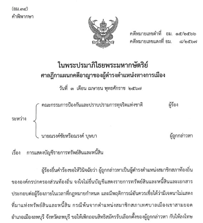 สำนักข่าวอิศรา www.isranews.org รายงานว่า วันที่ 3 เมษายน 2567 ศาลฎีกาแผนกคดีอาญาของผู้ดำรงตำแหน่งทางการเมืองพิพากษาว่านายณรงค์ชัย หรือ ณรงค์ บุษบา สมาชิกสภาเทศบาลเมืองเขาสามยอด อ.เมืองลพบุรี จ.ลพบุรี ผู้ถูกกล่าวหา จงใจไม่ยื่นบัญชีแสดงรายการทรัพย์สินและหนี้สินและเอกสารประกอบต่อคณะกรรมการป้องกันและปราบปรามการทุจริตแห่งชาติ (คณะกรรมการ ป.ป.ช.) ผู้ร้อง และมีพฤติการณ์อันควรเชื่อได้ว่ามีเจตนาไม่แสดงที่มาแห่งทรัพย์สินหรือหนี้สิน กรณีพ้นจากตำแหน่งสมาชิกสภาเทศบาลเมืองเขาสามยอด ให้เพิกถอนสิทธิสมัครรับเลือกตั้งของผู้ถูกกล่าวหาตลอดไป ลงโทษจำคุก 2 เดือน และปรับ 7,000 บาท ผู้ถูกกล่าวหาให้การรับสารภาพเป็นประโยชน์แก่การพิจารณามีเหตุบรรเทาโทษ ลดโทษให้กึ่งหนึ่ง คงจำคุก 1 เดือนและปรับ 3,500 บาท ไม่ปรากฏว่าผู้ถูกกล่าวหาเคยได้รับโทษจำคุกมาก่อน โทษจำคุกให้ รอการลงโทษไว้มีกำหนด 1 ปี รายละเอียดดังนี้