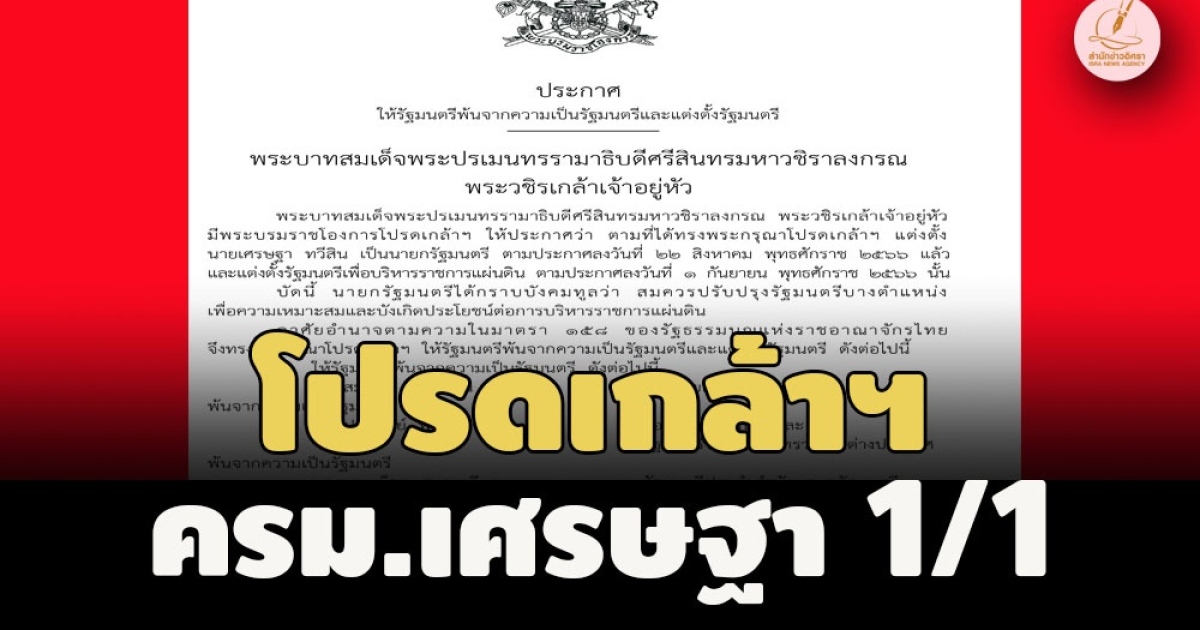 • โปรดเกล้าฯ ครม.เศรษฐา1/1 ไม่พลิก 'พิชัย'รองนายกฯควบคลัง-'ชลน่าน' หลุดสธ.'สมศักดิ์' เสียบ