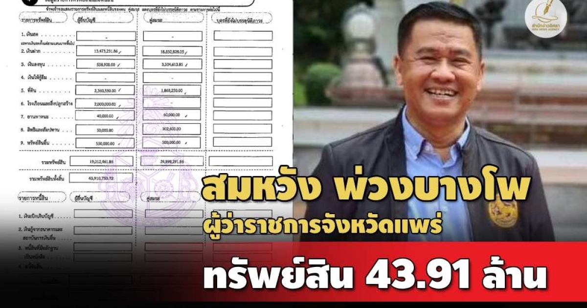 ป.ป.ช.เปิดทรัพย์สิน 'สมหวัง พ่วงบางโพ' ผู้ว่าฯ แพร่ มีทรัพย์สินกว่า 43.91 ล. เงินฝาก 13 ล. ที่ดิน 5 แปลง สะสมสร้อยคอทองคำ-ทองคำแท่ง-พระเครื่อง รายได้ 1.3 ล./ปี