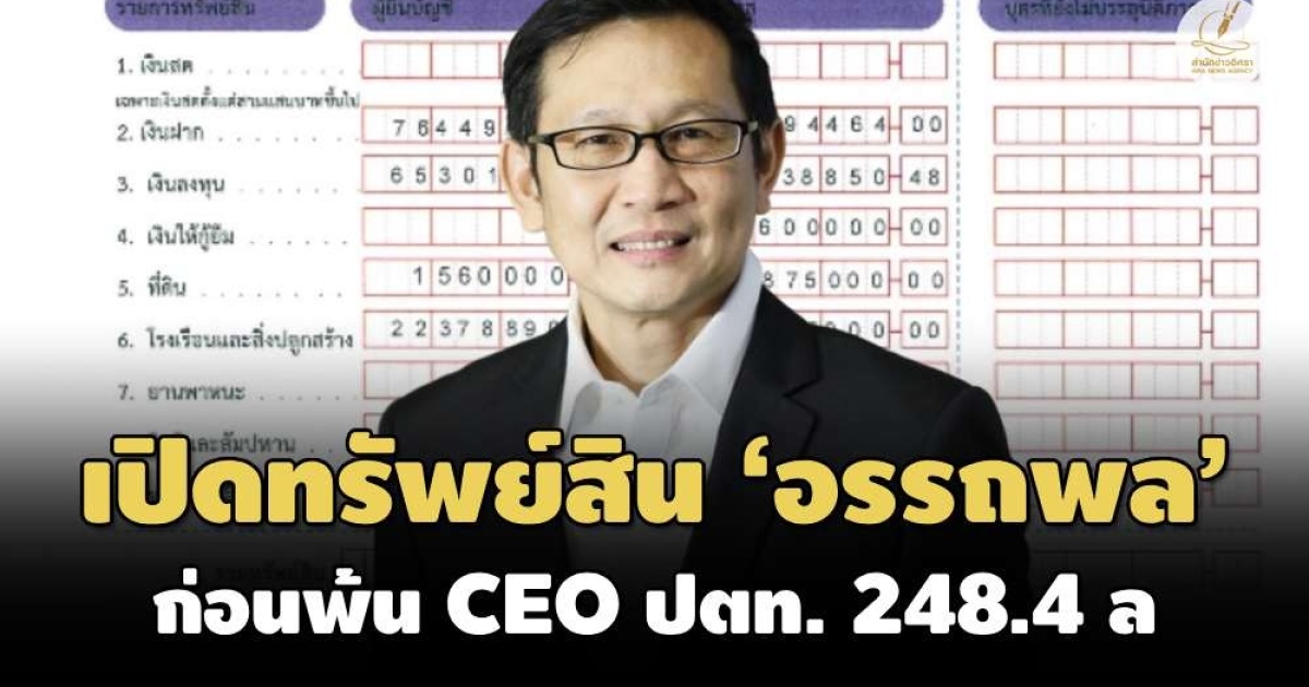 เปิดทรัพย์สิน ‘อรรถพล ฤกษ์พิบูลย์’ ก่อนพ้น ปธ.เจ้าหน้าที่บริหาร กก.ผจก.ใหญ่ ปตท. 12 พ.ค.2567 แจ้ง ป.ป.ช. 24 เม.ย. 2566 พร้อมคู่สมรส 248.4 ล. เงินฝาก 76 ล. ลงทุน 2 คน 113.7 ล.โบนัส เบี้ยประชุม 24.7 ล. รายได้เบ็ดเสร็จ 47.8 ล./ปี