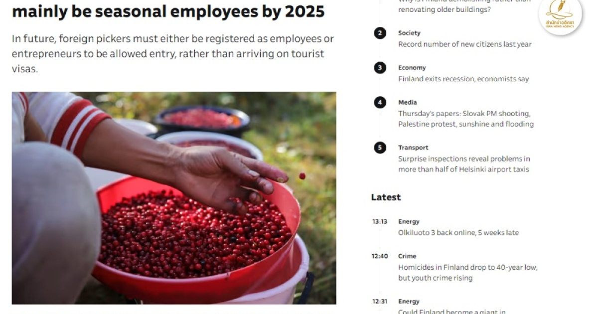 สำนักข่าวอิศรา (www.isranews.org) รายงานข่าวสถานการณ์เกี่ยวกับแรงงานเก็บเบอร์รี่ที่ประเทศฟินแลนด์ว่าเมื่อวันที่ 15 พ.ค.ทีผ่านมา คณะกรรมการระดับรัฐมนตรีของฟินแลนด์ว่าด้วยการจ้างงานและการเป็นผู้ประกอบการได้สรุปการเปลี่ยนแปลงตามแผนงานในกฎหมายแรงงานตามฤดูกาลที่ควบคุมเรื่องแรงงานเก็บเบอร์รี่ป่าจากต่างประเทศ โดยสรุปเนื้อหาว่าในอนาคตแรงงานเก็บเบอร์ที่มาที่ประเทศฟินแลนด์ควรมาด้วยสัญญาจ้างงานตามฤดูกาล