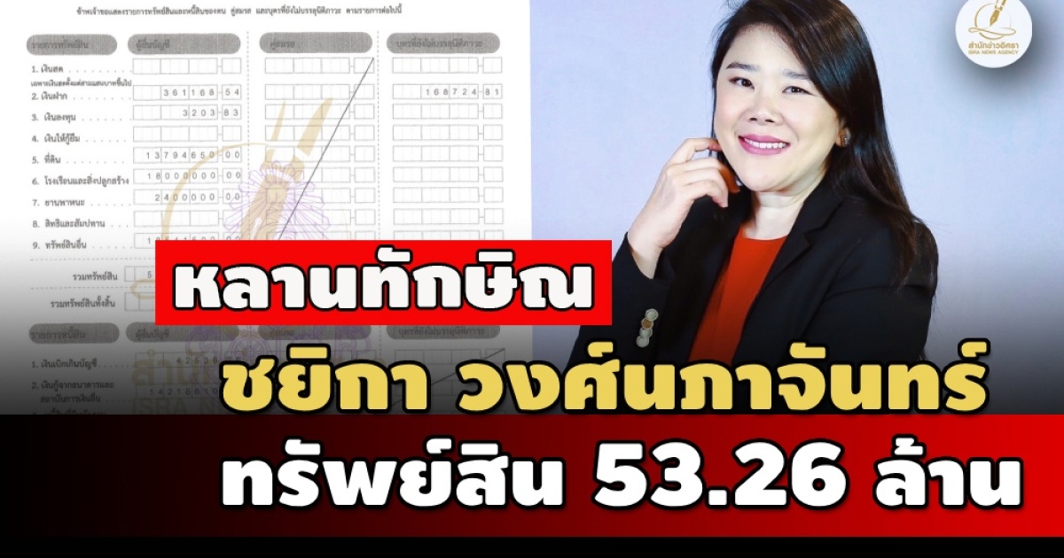 โดย น.ส.ชยิกา และบุตรที่ยังไม่บรรลุนิติภาวะ อายุ 10 ปี แจ้งมีทรัพย์สินทั้งสิ้น 53,269,247.18 บาท หนี้สินทั้งสิ้น 14,259,147.52 บาท