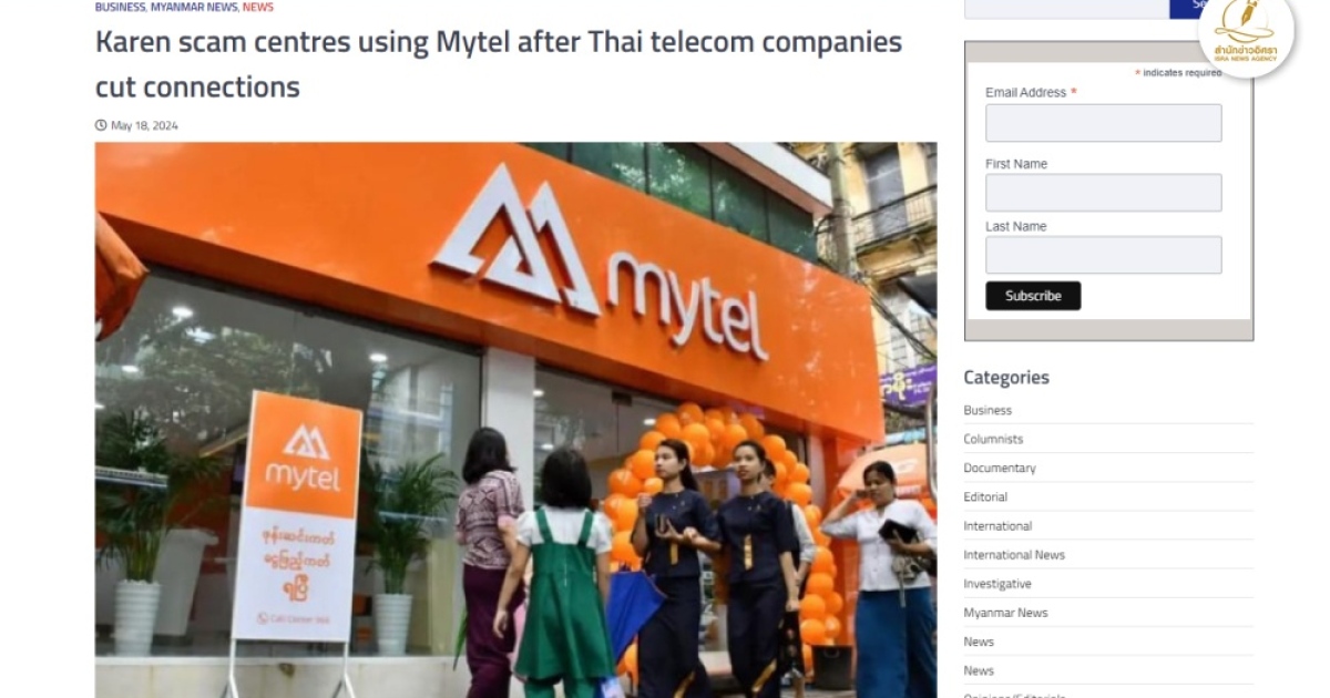 สื่อเมียนมาเผยไทยตัดเน็ตไม่มีผล ศูนย์ฉ้อโกงใช้บริการ Mytel บ.โทรคมนาคมร่วมทุนบริษัทเครือเผด็จการทหาร-กองทัพเวียดนามเดินหน้าทำกิจการต่อ