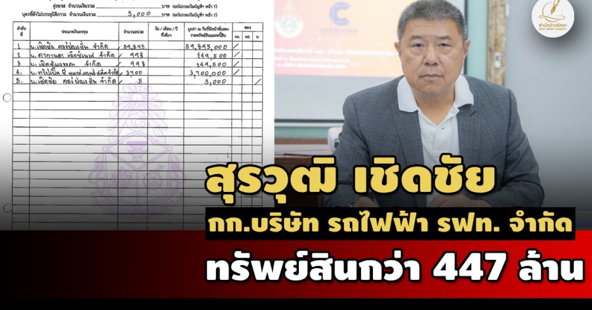 ป.ป.ช.เปิดทรัพย์สินผู้ดำรงตำแหน่งระดับสูง 'สุรวุฒิ เชิดชัย' กก.บริษัท รถไฟฟ้า รฟท. จำกัด ลูก 'เจ๊เกียว' มีทรัพย์สินกว่า 447 ล. ที่ดิน 208 แปลง กว่า 1,900 ไร่ เงินลงทุนกว่า 64 ล.