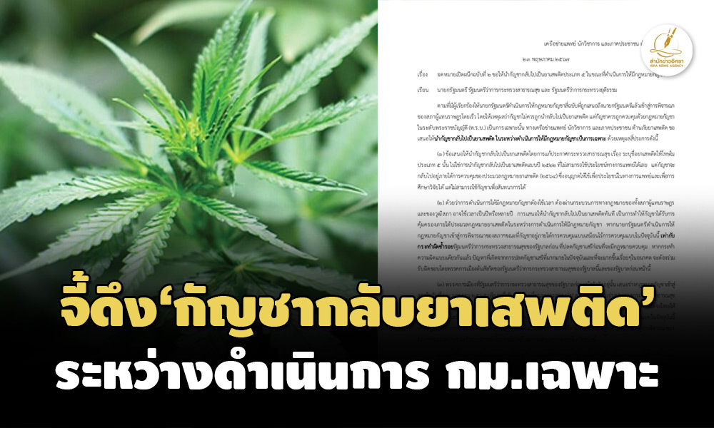 (1 ) ข้อเสนอให้นำกัญชากลับไปเป็นยาเสพติดโดยการแก้ประกาศกระทรวงสาธารณสุข เรื่อง ระบุชื่อยาเสพติดให้โทษในประเภท 5 นั้น ไม่ใช่การนำกัญชากลับไปเป็นยาเสพติดแบบปี 2522 ที่ไม่สามารถใช้ประโยชน์ทางการแพทย์ได้เลย แต่กัญชาจะกลับไปอยู่ภายใต้การควบคุมของประมวลกฎหมายยาเสพติด (2564) ซึ่งอนุญาตให้ใช้เพื่อประโยชน์ในทางการแพทย์และเพื่อการศึกษาวิจัยได้ แต่ไม่สามารถใช้กัญชาเพื่อสันทนาการได้