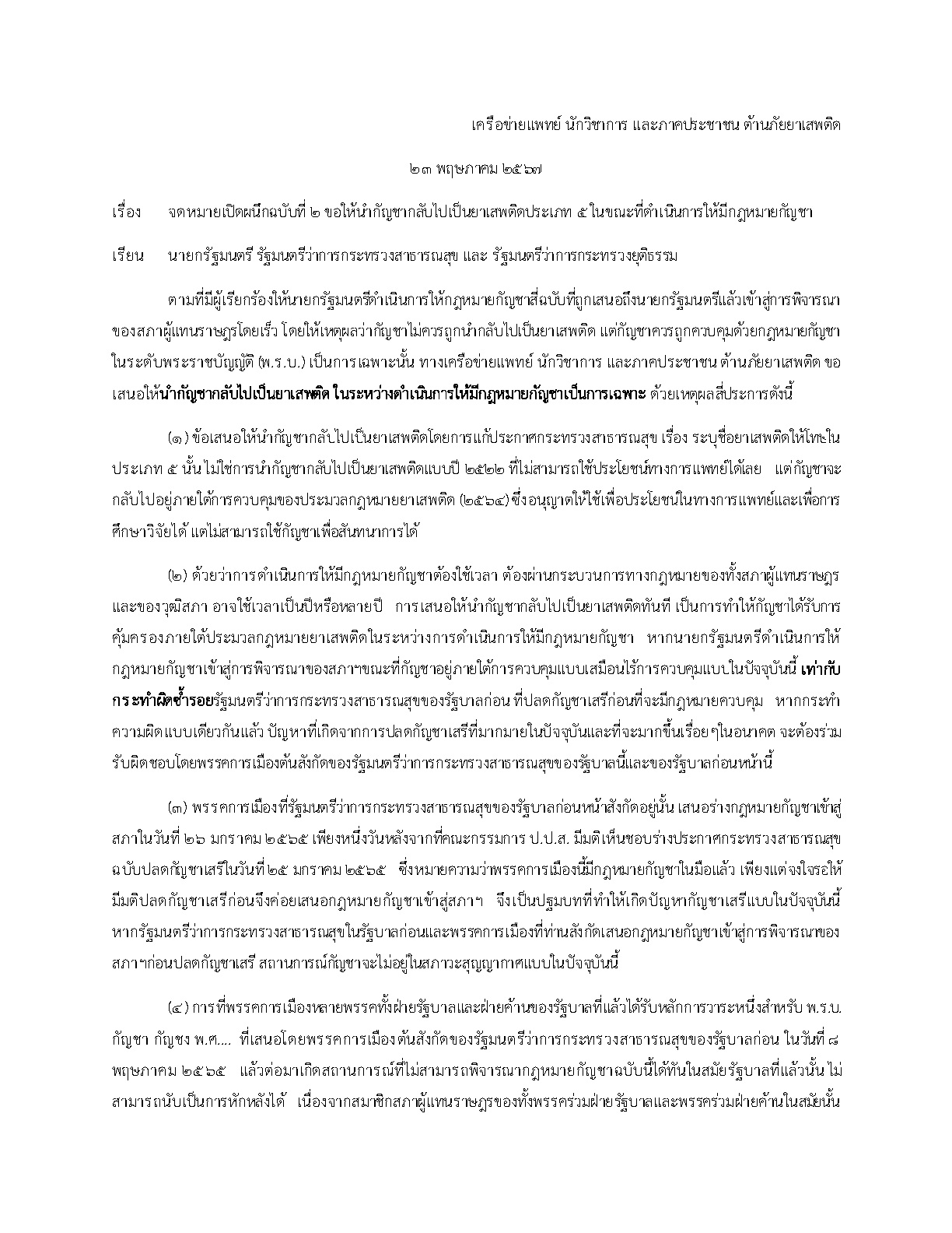 สำนักข่าวอิศรา (www.isranews.org) รายงานว่า เมื่อวันที่ 23 พ.ค. 2567 เครือข่ายแพทย์ นักวิชาการ และภาคประชาชน ต้านภัยยาเสพติด รวม 66 ราย ได้ยื่นจดหมายเปิดผนึกฉบับที่ 2 เรื่อง ขอให้นำกัญชากลับไปเป็นยาเสพติดประเภท 5 ในขณะที่ดำเนินการให้มีกฎหมายกัญชา ถึงนายกรัฐมนตรี รัฐมนตรีว่าการกระทรวงสาธารณสุข และ รัฐมนตรีว่าการกระทรวงยุติธรรม พร้อมให้เหตุผลการสนับสนุน 4 ประการ ดังนี้