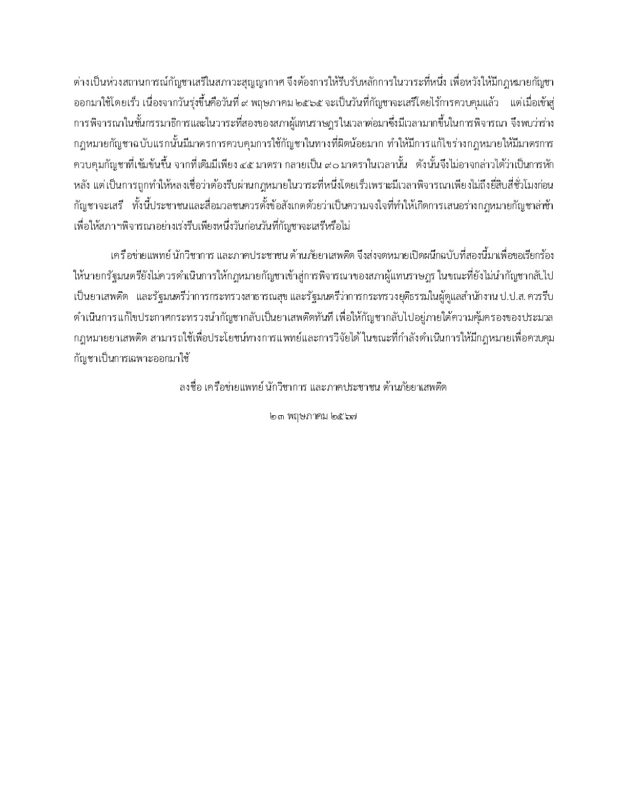 ของสภาผู้แทนราษฎรโดยเร็ว โดยให้เหตุผลว่ากัญชาไม่ควรถูกน กลับไปเป็นยาเสพติด แต่กัญชาควรถูกควบคุมด้วยกฎหมายกัญชาในระดับพระราชบัญญัติ (พ.ร.บ.) เป็นการเฉพาะนั้น ทางเครือข่ายแพทย์ นักวิชาการ และภาคประชาชน ต้านภัยยาเสพติด ขอเสนอให้นำกัญชากลับไปเป็นยาเสพติด ในระหว่างด เนินการให้มีกฎหมายกัญชาเป็นการเฉพาะ ด้วยเหตุผลสี่ประการดังนี้