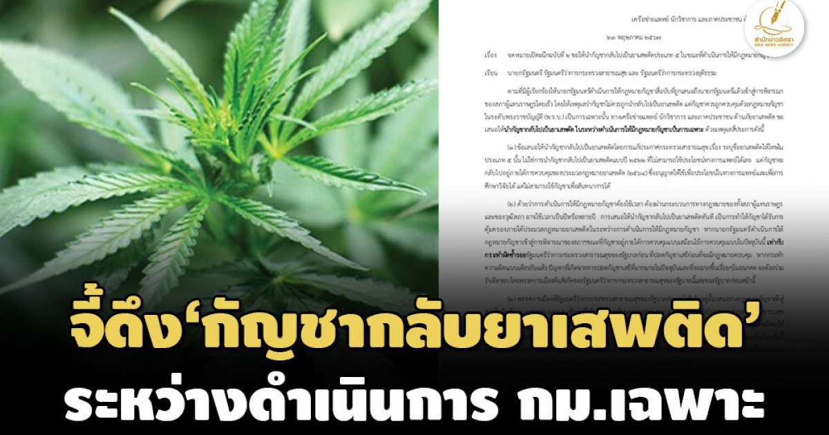 เครือข่ายแพทย์ นักวิชาการ และภาคประชาชน ต้านภัยยาเสพติด รวม 66 ราย ยื่นจดหมายเปิดผนึก จี้รัฐบาลนำกัญชากลับไปเป็นยาเสพติดประเภท 5 ในระหว่างดำเนินการให้มีกฎหมายกัญชาเป็นการเฉพาะ