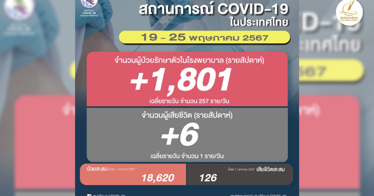 สถานการณ์โควิดไทย สัปดาห์ล่าสุด 19 - 25 พ.ค. 2567 ติดเชื้อเข้ารักษาใน รพ.ใหม่ 1,801 ราย เฉลี่ย 257/วัน เสียชีวิต 6 ราย
