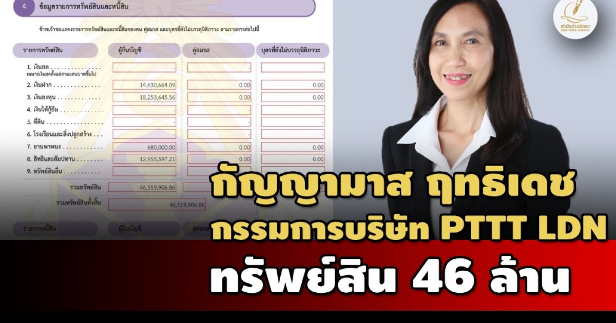 ป.ป.ช.เปิดทรัพย์สินผู้ดำรงตำแหน่งระดับสูง 'กัญญามาส ฤทธิเดช' กก.บริษัท PTTT LDN มีทรัพย์สินกว่า 46.51 ล. เงินฝาก 14 ล. เงินลงทุน 18 ล. ถือหุ้นหลายแห่ง เอสซีแอสเสท-อิตาเลียนไทย รายได้ 7 ล./ปี