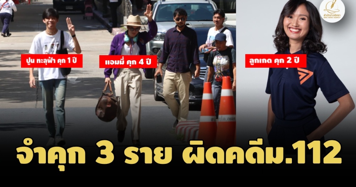 ศาลอาญาพิพากษาจำคุก 'แอมมี่ เดอะ บอตทอม บลูส์' 4 ปี-'ธนพัฒน์ กาเพ็ง' 1 ปี ไม่รอลงอาญา คดีเผาพระบรมฉายาลักษณ์ หน้าเรือนจำคลองเปรม ปี 2564 ด้าน 'สส.ลูกเกด ก้าวไกล' ศาลธัญบุรีพิพากษาคดีชุมนุมเรียกร้องปล่อยตัวผู้ต้องขังทางการเมืองปี 2564 ทำผิด ม.112 จำคุก 2 ปี ไม่รอลงอาญา-ภายหลังให้ประกันตัว