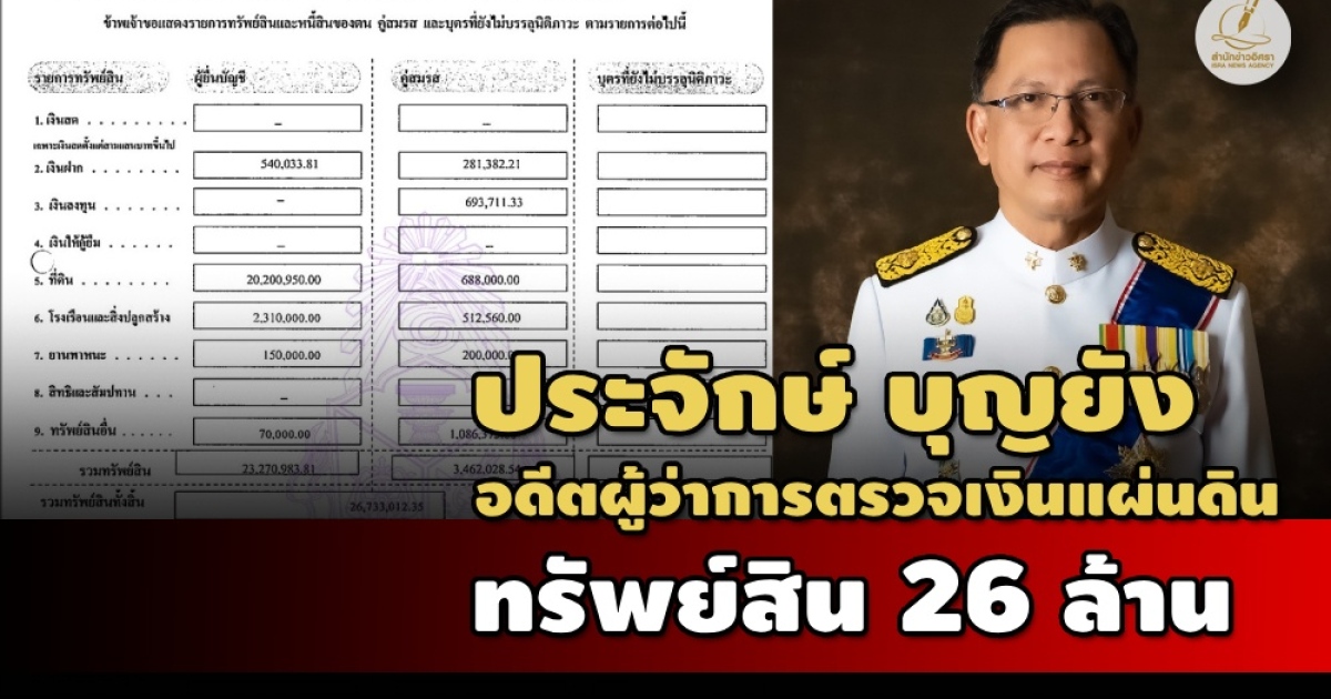 ป.ป.ช.เปิดทรัพย์สินผู้ดำรงตำแหน่งทางการเมือง 'ประจักษ์ บุญยัง' พ้นตำแหน่งผู้ว่าการตรวจเงินแผ่นดิน ทรัพย์สินกว่า 26.73 ล. มีที่ดิน 44 ไร่ รวมมูลค่า 20 ล. รายได้ 4 แสน/ปี