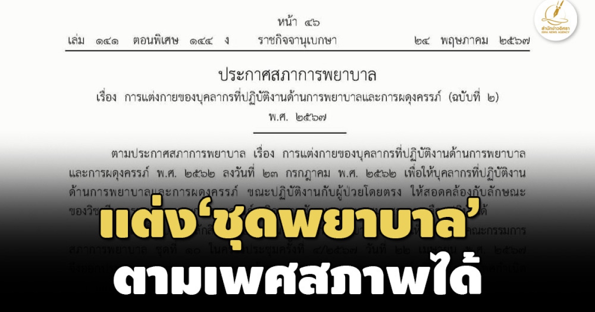 ราชกิจจาฯ แพร่ประกาศสภาการพยาบาล อนุญาตให้การแต่งชุดพยาบาลตามเพศสภาพขณะปฏิบัติหน้าที่ได้เพื่อให้เป็นไปตามหลักสิทธิมนุษยชน