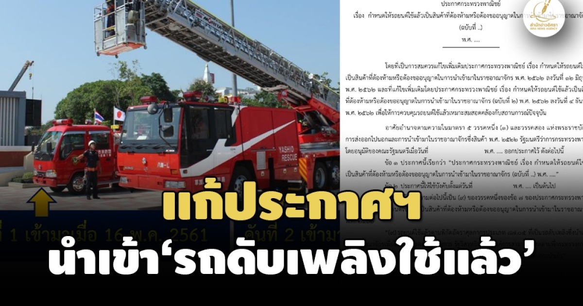 “(9) รถยนต์ใช้แล้วตามพิกัดอัตราศุลกากรประเภท 87.05 ที่เป็นรถดับเพลิงซึ่งนำเข้ามาในราชอาณาจักรเพื่อใช้ในงานของส่วนราชการ รัฐวิสาหกิจ หรือองค์การสาธารณกุศลตามที่กระทรวงการคลังกำหนด โดยมีหนังสือรับรองจากกระทรวงมหาดไทยไปแสดงต่อกรมศุลกากรประกอบการนำเข้า” ร่างประกาศกระทรวงพาณิชย์ เรื่อง กำหนดให้รถยนต์ใช้แล้วเป็นสินค้าที่ต้องห้ามหรือต้องขออนุญาตในการนำเข้ามาในราชอาณาจักร (ฉบับที่ ..) พ.ศ. .... ที่เปิดรับฟังความเห็นฯ ระบุ