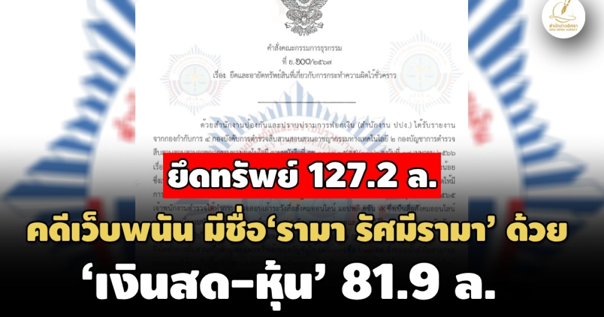 ปปง.สั่งยึดอายัดทรัพย์ 133 รายการ 127.2 ล. คดีเว็บพนันออนไลน์-ฟอกเงิน กลุ่ม ‘นวปรินธ์ ทองน้อย’พวก มีชื่อ‘รามา รัศมีรามา’ด้วย ถือครองทรัพย์สินในบัญชีซื้อขายหลักทรัพย์บัวหลวงเงินสด หุ้น 81.9 ล. รถหรู 5 คัน เงินสด เงินฝาก เครื่องประดับอื้อ ผู้ต้องหา 10 คน