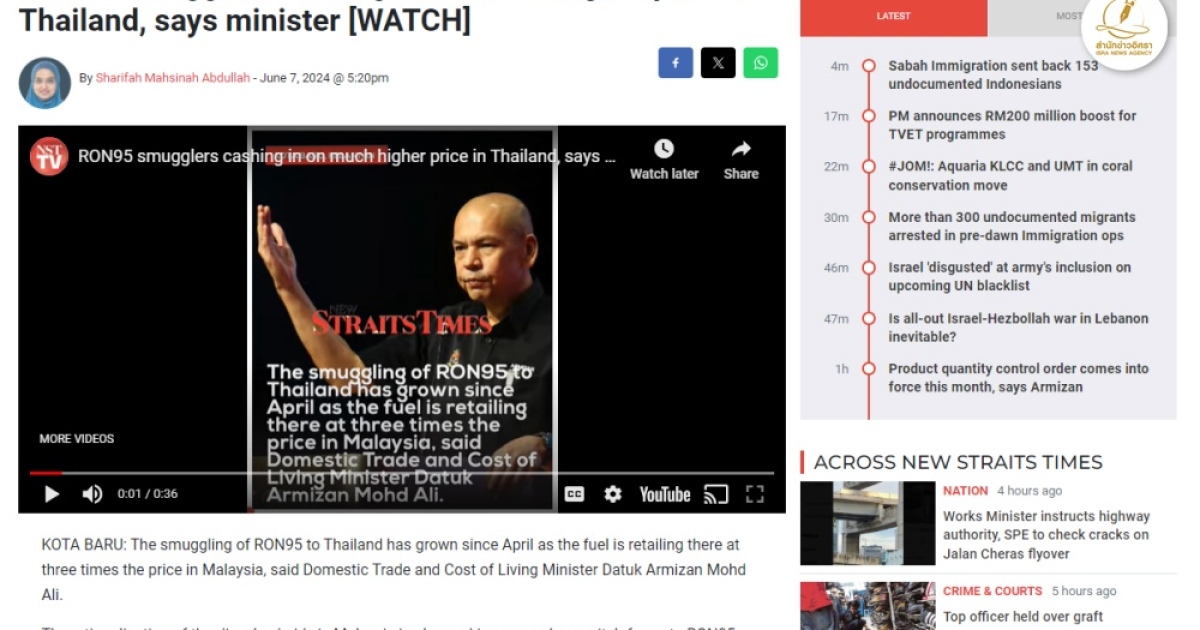สำนักข่าวอิศรา (www.israenews.org) รายงานข่าวเกี่ยวกับขบวนการลักลอบนำเข้าน้ำมันเถื่อนจากมาเลเซียมายังประเทศไทยว่านายดาต๊ก อาร์มิซาน โมห์ อาลี รัฐมนตรีว่าการกระทรวงการค้าภายในประเทศและค่าครองชีพของมาเลเซียได้ออกมากล่าวเมื่อวันที่ 6 มิ.ย.ว่าการลักลอบขนน้ำมัน RON95 ไปขายยังประเทศไทยเพิ่มขึ้นตั้งแต่เดือนเมษายน เนื่องจากน้ำมันเชื้อเพลิงขายปลีกที่นั่นในราคาสามเท่าของราคาในมาเลเซีย