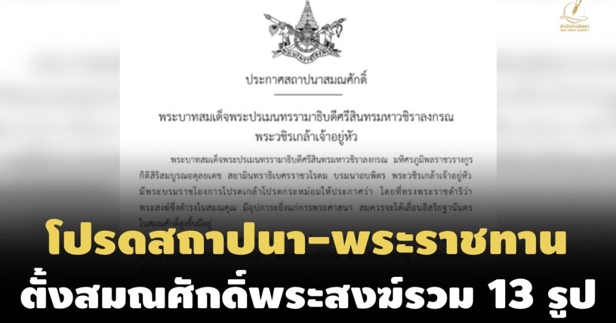 ราชกิจจาฯเผยแพร่ประกาศโปรดสถาปนาสมณศักดิ์ ‘พระธรรมวิสุทธาจารย์’ วัดบวรฯ เป็น พระพรหมวชิรมล พร้อมพระราชทานสัญญาบัตรตั้งสมณศักดิ์พระสงฆ์ 12 รูป