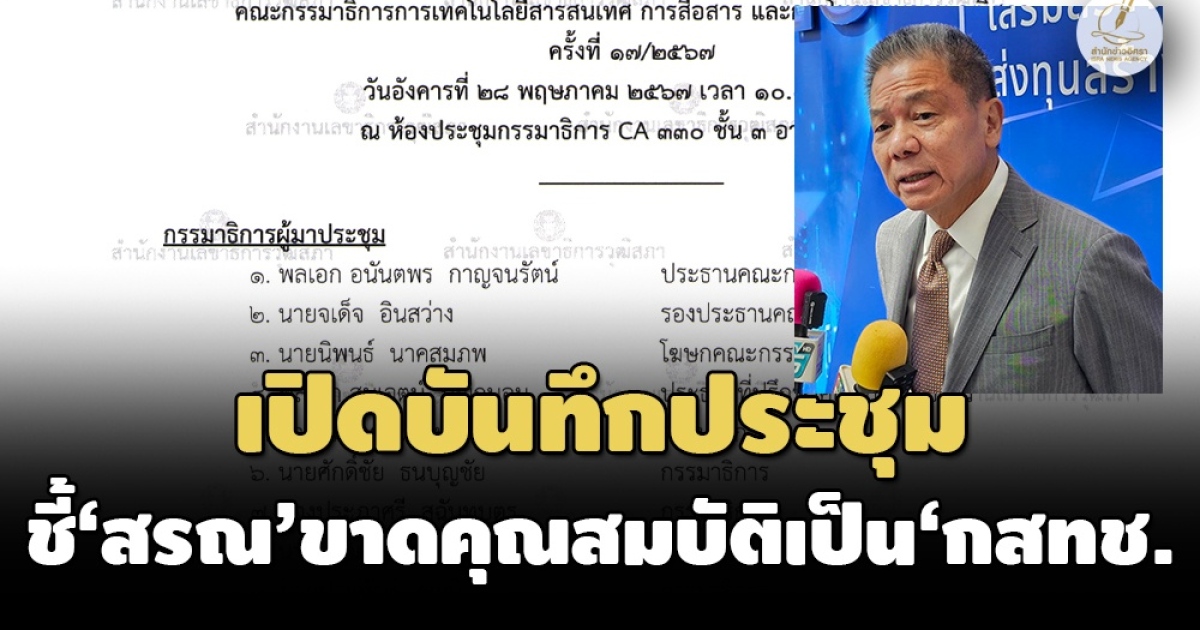 ‘กมธ.ไอซีที’ วุฒิสภา แพร่รายงานการประชุมฯ ชี้ ‘นพ.สรณ’ มีลักษณะต้องห้าม เป็น ‘กสทช.’ เหตุยังมีสถานะเป็น ‘พนักงานของหน่วยงานของรัฐ’ ก่อนนำชื่อขึ้นทูลเกล้าฯ พบยอมให้เสนอชื่อเป็น ‘กก.แบงก์กรุงเทพ’ ก่อนและหลังได้รับโปรดเกล้าฯ
