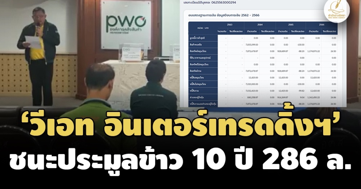 ‘บ.วีเอท อินเตอร์เทรดดิ้งฯ’ ชนะประมูลซื้อข้าวสารอายุ 10 ปี เสนอราคาซื้อสูงสุดทั้ง 2 คลัง รวม 286 ล้าน ขณะที่ ‘อคส.’ ลุยต่อรองเพื่อให้ราคาเพิ่มขึ้น ก่อนประกาศชื่อผู้ชนะอย่างเป็นทางการไม่เกิน 21 มิ.ย.นี้ เผยปี 66 บริษัทฯมีส่วนทุนของผู้ถือหุ้น 1.16 ล้านบาท กำไร 2.46 แสนบาท