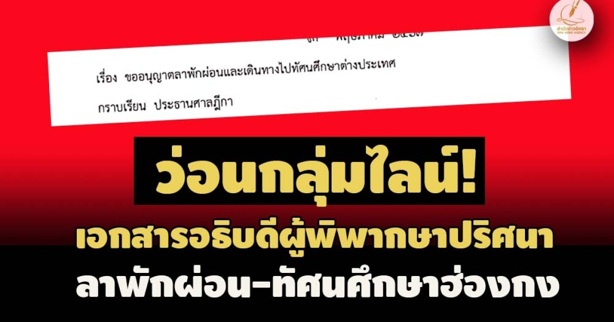ล่าสุด ในช่วงเย็นวันที่ 17 มิ.ย.2567 ในกลุ่มไลน์ผู้พิพากษา มีการส่งแชร์ต่อเอกสารการชุดการทำเรื่องขออนุญาตลาพักผ่อนและเดินทางไปทัศนศึกษาของอธิบดีผู้พิพากษารายหนึ่ง ที่ฮ่องกง ระหว่างวันที่ 23 -26 พ.ค.2567