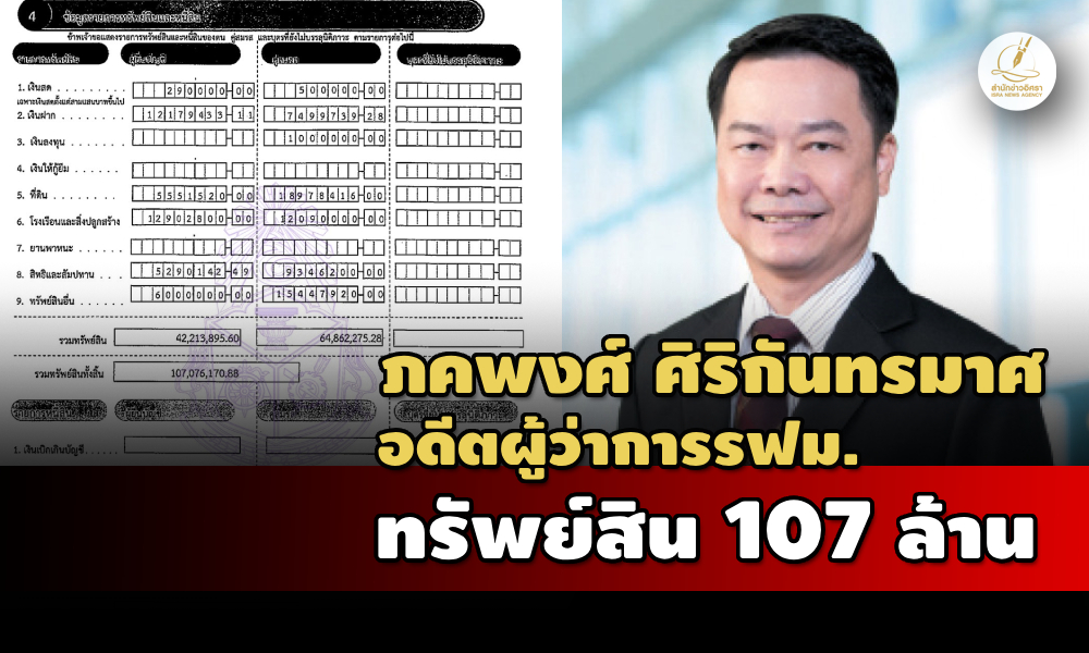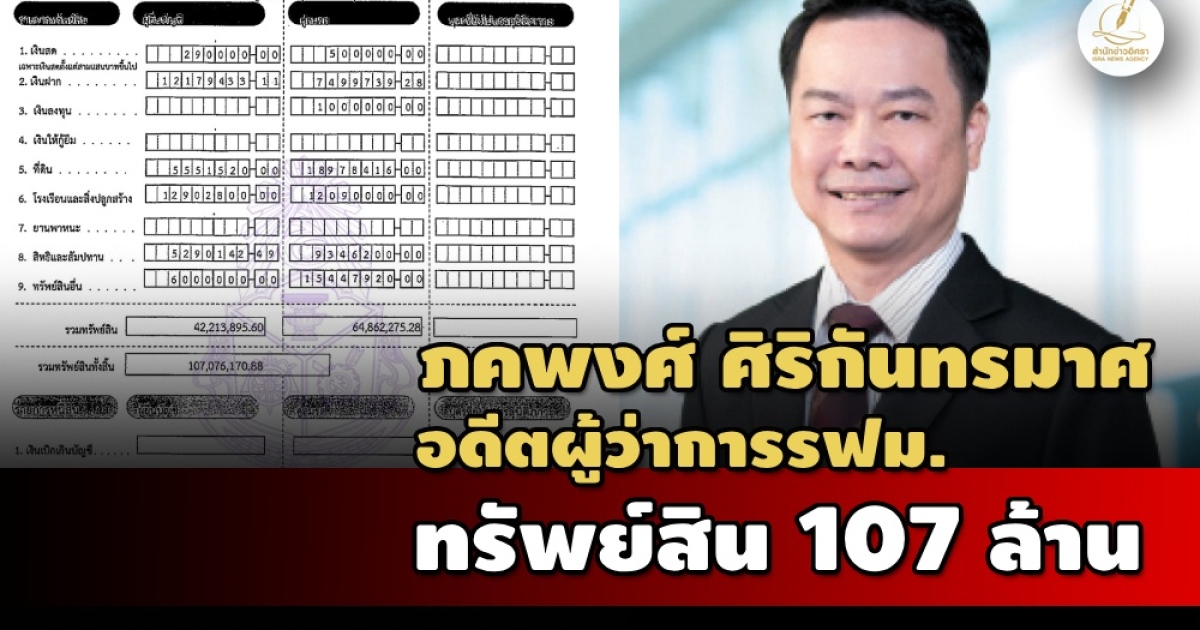 ป.ป.ช.เปิดทรัพย์สินผู้ดำรงตำแหน่งระดับสูง 'ภคพงศ์ ศิริกันทรมาศ' พ้นตำแหน่ง ผู้ว่าการการรถไฟฟ้าขนส่งมวลชนแห่งประเทศไทย ทรัพย์สิน 107 ล. เงินฝาก 12 ล. สะสมนาฬิกาข้อมือ 26 เรือน รวมมูลค่า 6 ล. ไร้หนี้สิน