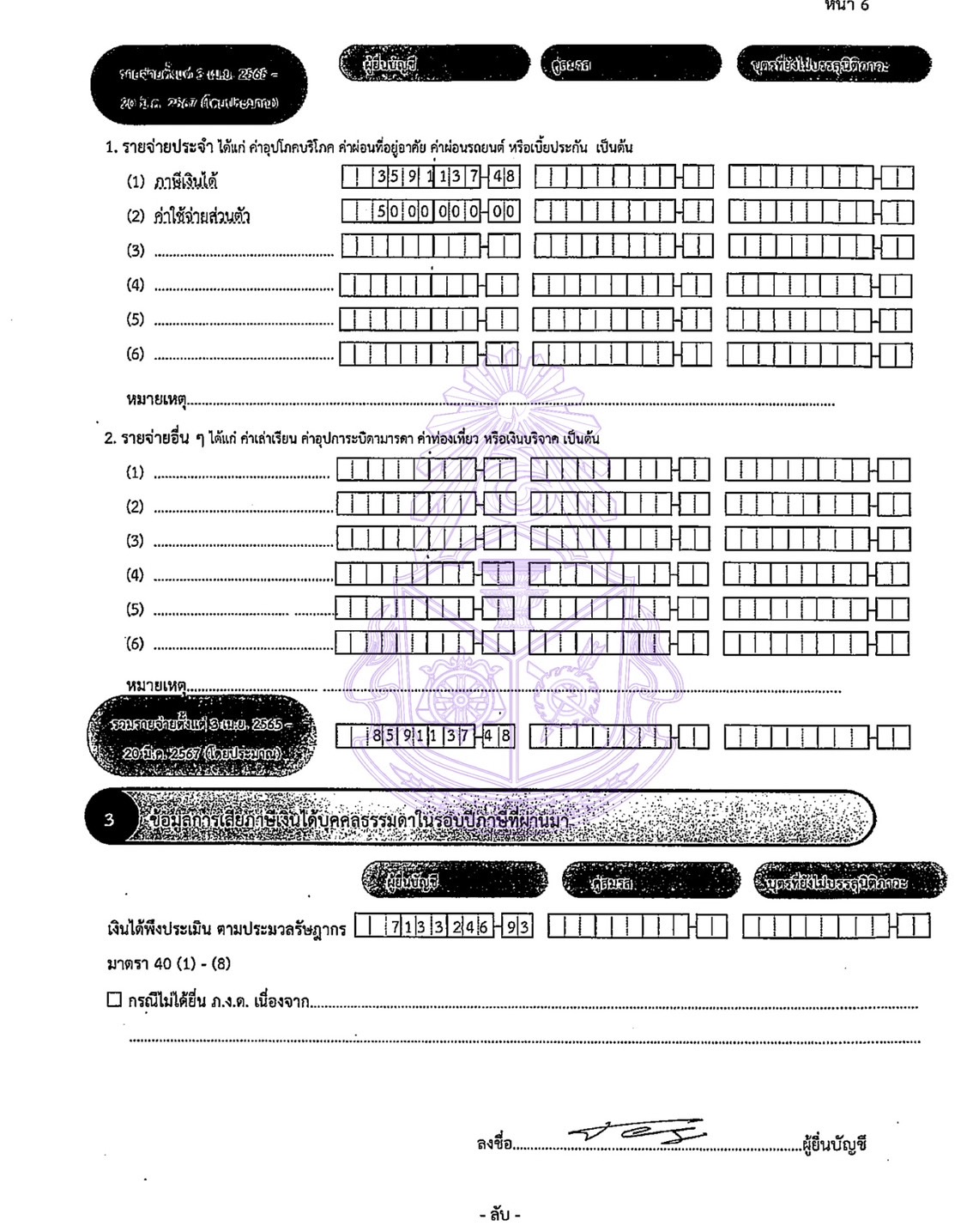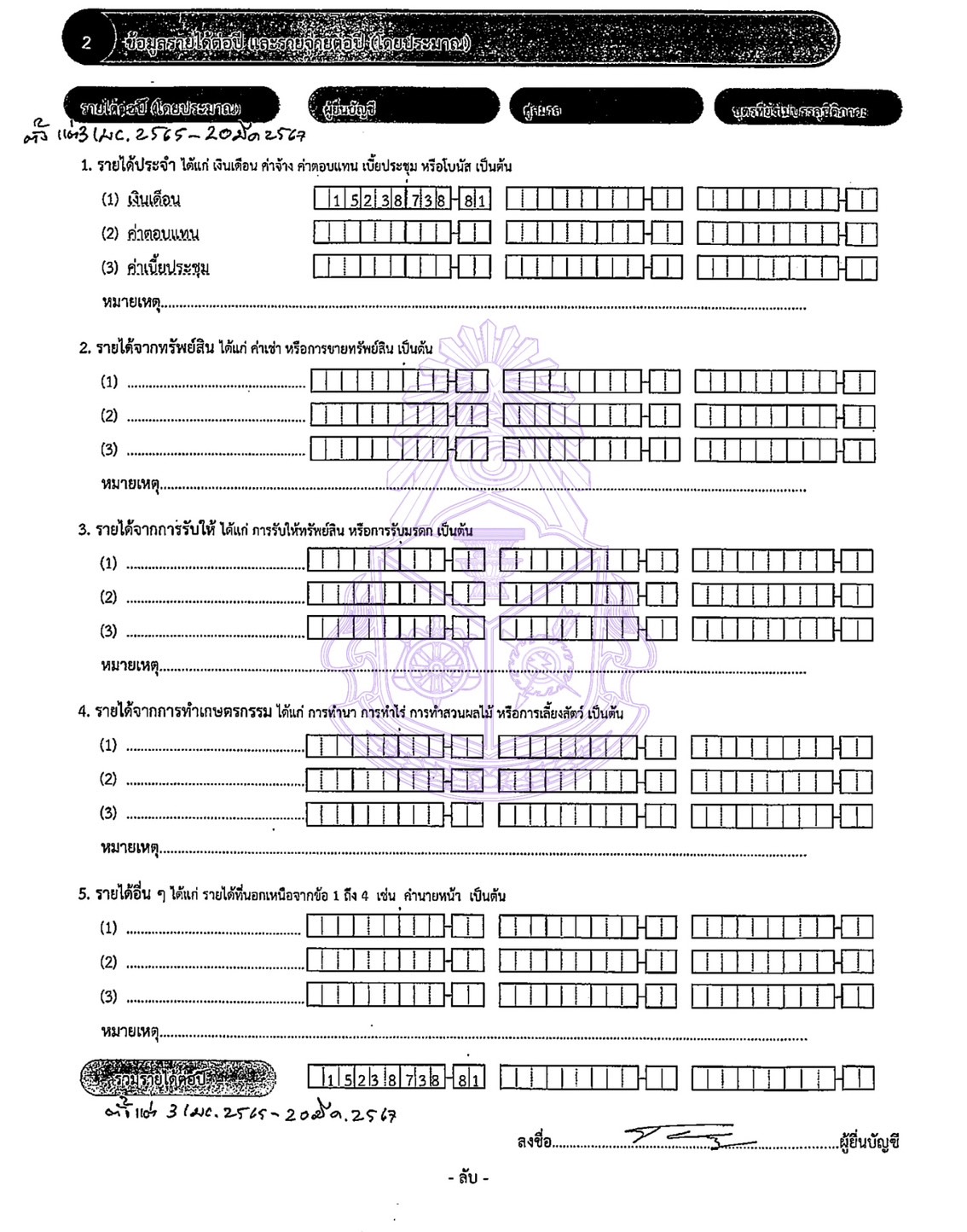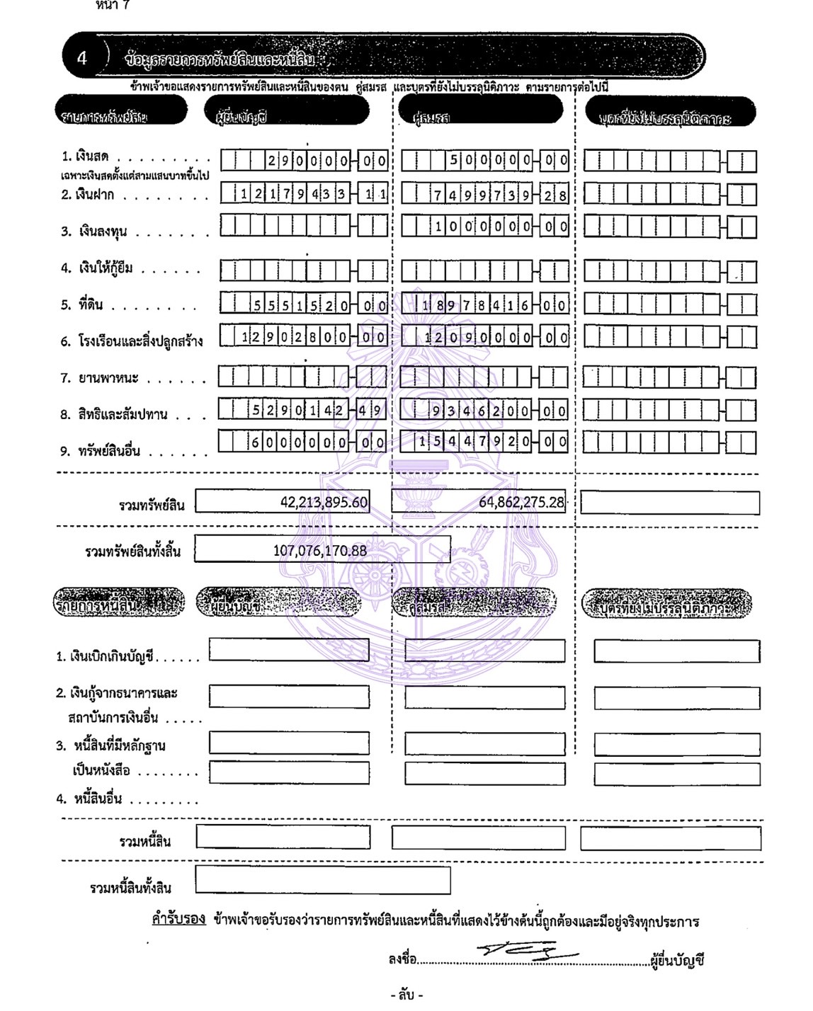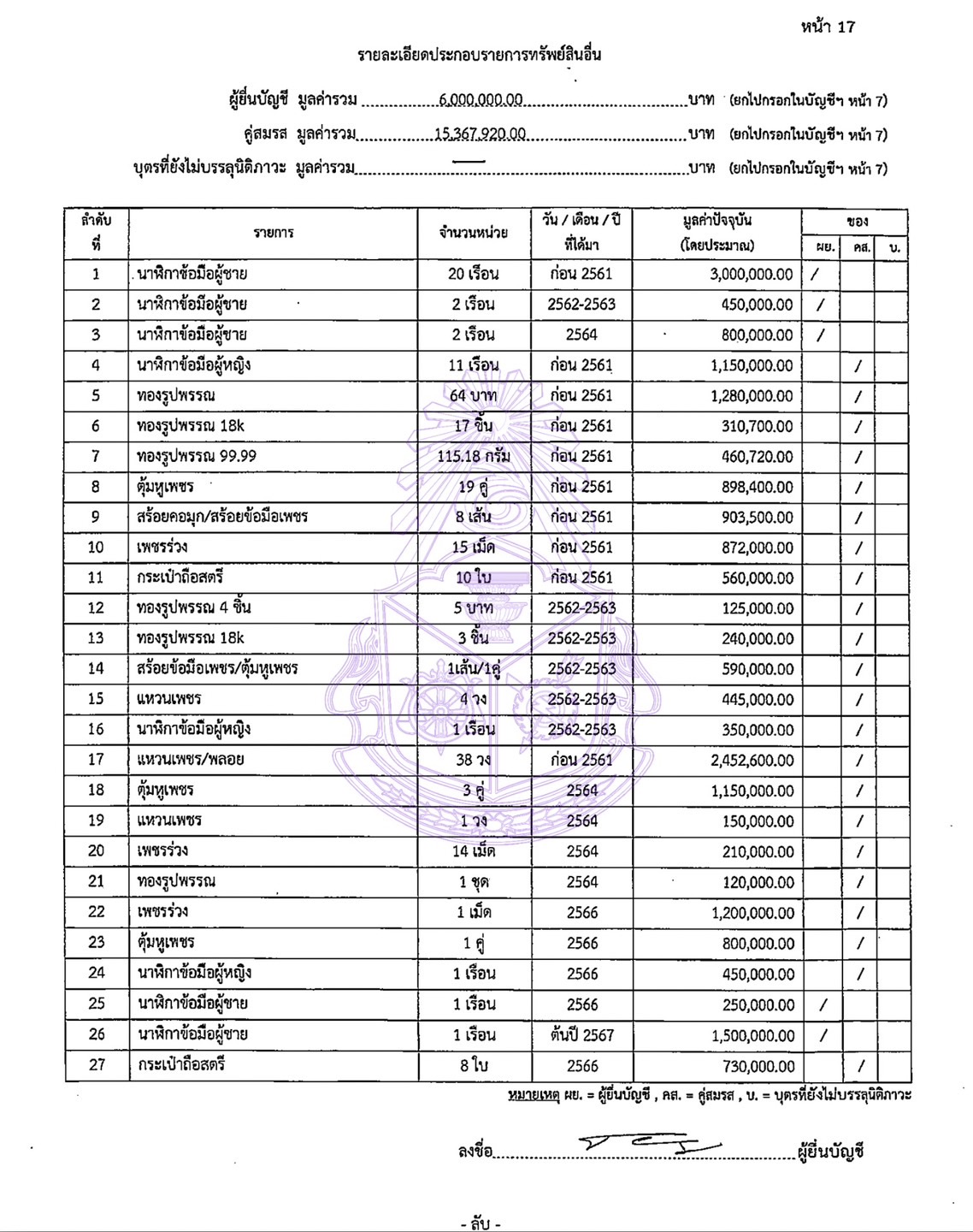 สิทธิและสัมปทาน 9,346,200 บาท ทรัพย์สินอื่น เช่น นาฬิกาข้อมือผู้หญิง ทองรูปพรรณ ตุ้มหูเพชร กระเป๋าถือสตรี เป็นต้น รวมมูลค่า 15,447,920 บาท