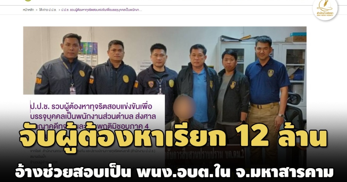 ป.ป.ช.จับผู้ต้องหา หนีคดีเรียกเงิน อ้างช่วยผ่านสอบบรรจุเป็นพนักงาน อบต.ใน จ.มหาสารคาม 39 ราย คิดเป็นเงิน 12 ล้าน เตรียมส่งตัวศาลอาญาคดีทุจริตฯ ภาค 4 ดำเนินการตามกฎหมาย