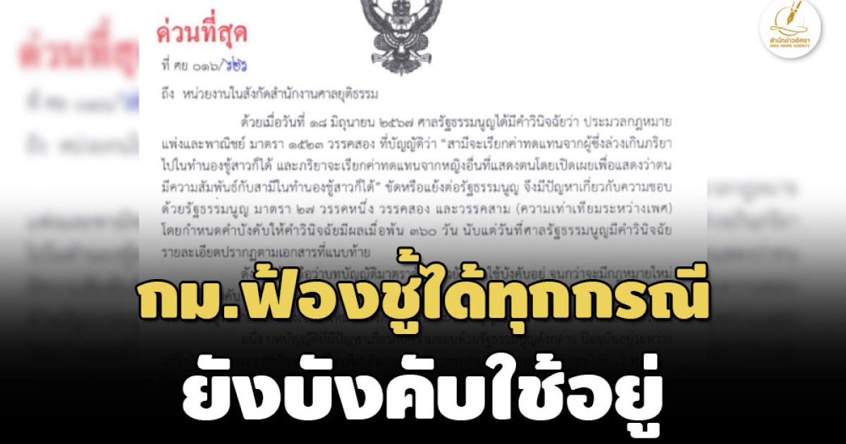 สำนักข่าวอิศรา (www.isranews.org) รายงานว่า สำนักงานศาลยุติธรรม ได้มีหนังสือเวียนด่วนที่สุด ถึงหน่วยงานในสังกัดสำนักงานศาลยุติธรรม ว่า กฎหมายแพ่งพาณิชย์ที่ให้สามี-ภริยา ฟ้องเรียกค่าเสียหายจากชู้ได้ทุกกรณียังมีผลใช้บังคับอยู่ จนกว่าจะมีกฎหมายใหม่ออกมาใช้บังคับหรือพ้น 360 วัน นับแต่วันที่ศาลรัฐธรรมนูญมีคำวินิจฉัย