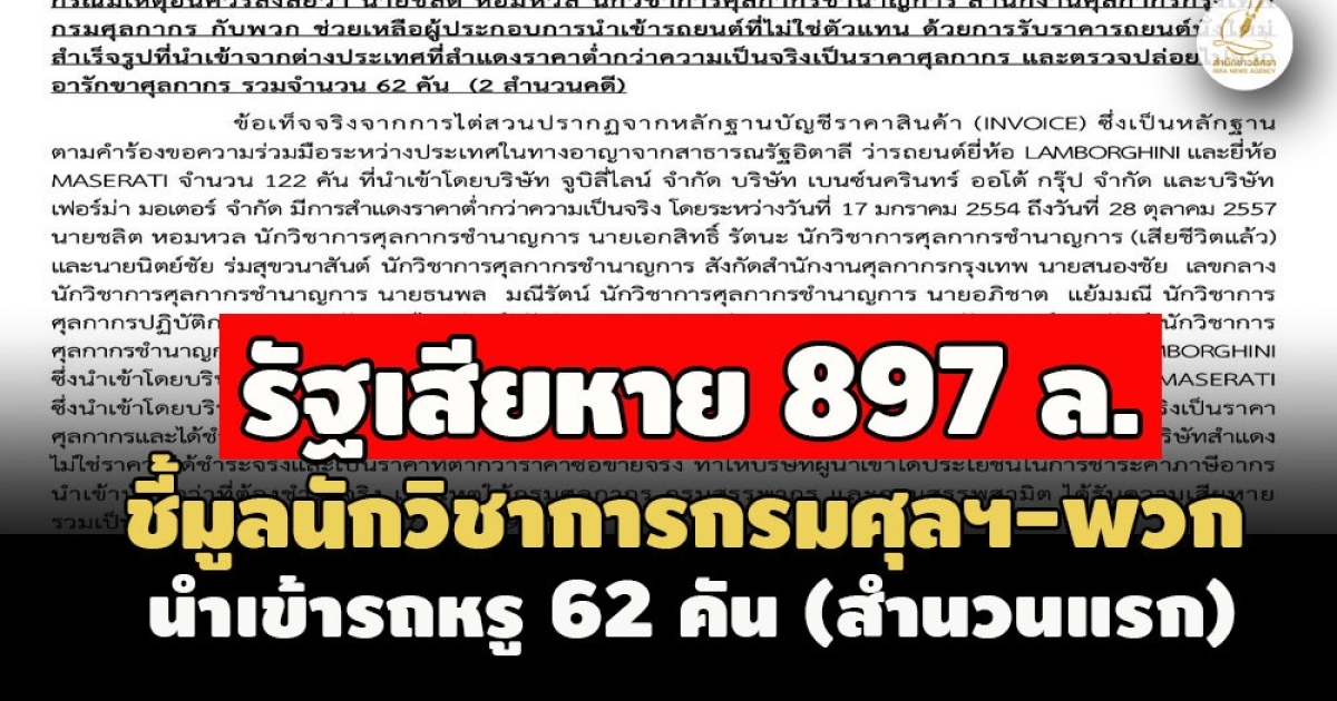 ป.ป.ช. เผยมติชี้มูลความผิดอาญา-วินัย 'ชลิต หอมหวล' นักวิชาการ กรมศุลกากร พวกรวม 7 ราย ช่วยเหลือผู้ประกอบการนำเข้ารถหรู 62 คันจาก 122 คัน สำแดงราคาต่ำกว่าความเป็นจริง รัฐเสียหาย 897,148,369 บาท - 3 เอกชน 'จูบิลี่ไลน์-เบนซ์นครินทร์ ออโต้ กรุ๊ป-เฟอร์ม่า มอเตอร์' โดนด้วย สนับสนุนเจ้าหน้าที่รัฐ ส่วนอีกสำนวน 'LAMBORGHINI-MASERATI ' 60 คัน อยู่ระหว่างการไต่สวน