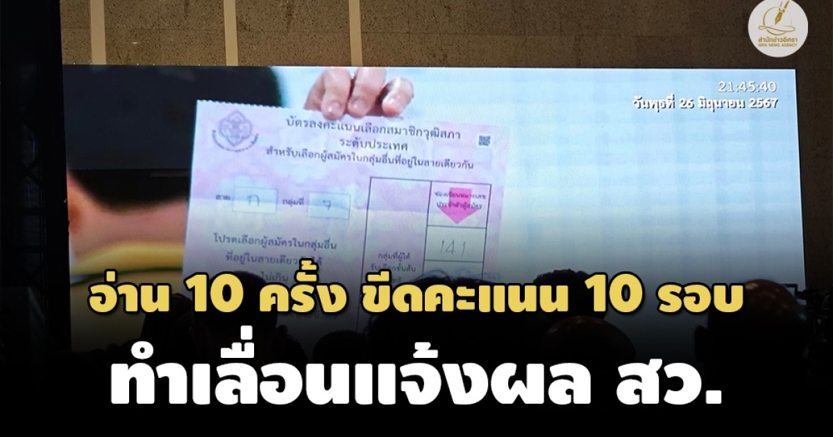 กกต.เผยการคัดเลือก สว. ล่าช้าหลังอ่าน-ขีดคะแนนแต่ละใบในรอบแรก 10 ครั้ง ลากเลือกรอบไขว้ช้าไปด้วย ขอแถลงผลการเลือกตั้งพรุ่งนี้ (27 มิ.ย.67) 'สมชาย-ศรีวราห์-ทนายตั้ม-อังคณา' ลุ้นเต็งเขารอบ