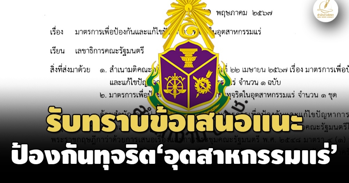สำนักข่าวอิศรา (www.isranews.org) รายงานว่า เมื่อวันที่ 25 มิ.ย.ที่ผ่านมา ที่ประชุมคณะรัฐมนตรี (ครม.) มีมติรับทราบมาตรการเพื่อป้องกันและแก้ไขปัญหาการทุจริตในอุตสาหกรรมแร่ ตามที่คณะกรรมการป้องกันและปราบปรามการทุจริตแห่งชาติ (ป.ป.ช.) เสนอ พร้อมทั้งมอบหมายให้กระทรวงอุตสาหกรรมร่วมกับหน่วยงานที่เกี่ยวข้องรับเรื่องนี้ไปพิจารณา และส่งเรื่องกลับมาให้สำนักเลขาธิการคณะรัฐมนตรีภายใน 30 วัน