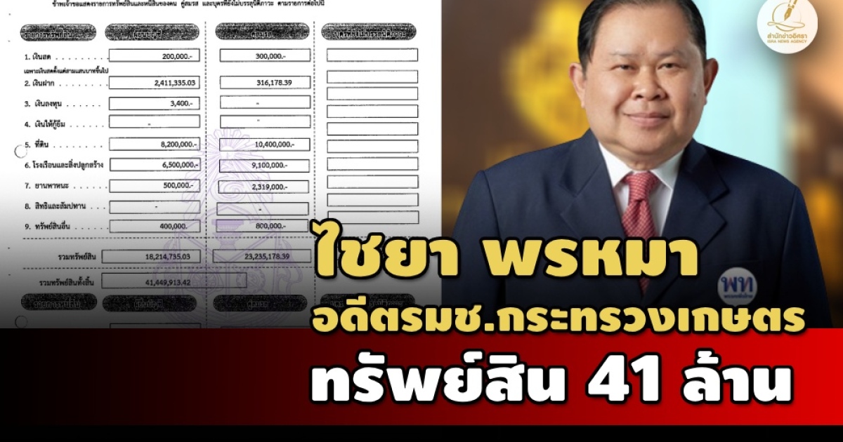 นายไชยา พร้อมนางอัญชลี พรมหา คู่สมรส แจ้งมีทรัพย์สินทั้งสิ้น 41,449,913.42 บาท หนี้สิน 2,284,706.67 บาท
