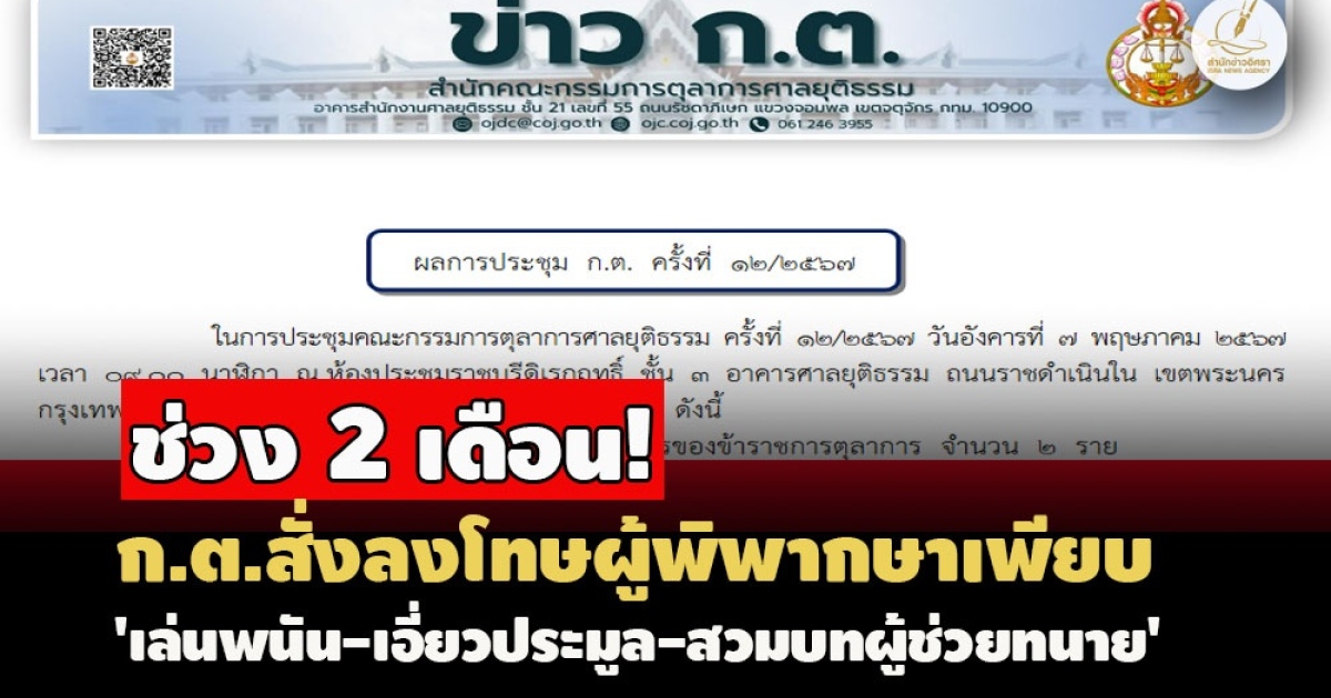 เผยมติที่ประชุม ก.ต. เดือนพ.ค.- มิ.ย.2567 พิจารณารายงานผลสอบสวนข้อเท็จจริงพฤติการณ์ผู้พิพากษาไม่เหมาะสมเพียบ เข้าไปเกี่ยวข้องกระบวนการประกวดราคามิชอบ ไม่มาปฏิบัติหน้าที่ตามคำสั่ง นำเงินค่าตอบแทนผู้ประนีประนอมไปบริหารจัดการโดยไม่ชี้แจงรายละเอียด เป็นนักพนัน สวมบทผู้ช่วยทนายความโจทก์ในคดีด้วย มีหลายบทลงโทษ ให้พ้นตำแหน่ง ปลด/ให้ออกราชการ รวมภาคทัณฑ์ทำทัณฑ์บนด้วย